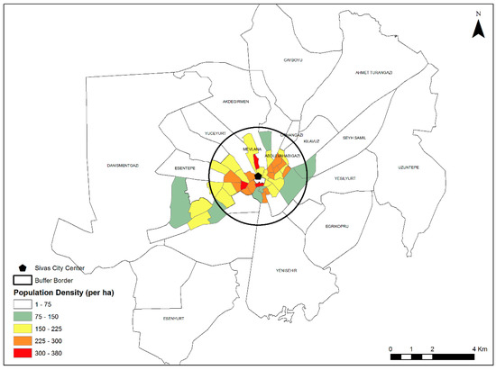 The following section provides the FD analysis of the relationship between urban geometry and land prices in 65 neighborhoods in the central district of Sivas province, and the obtained results. In this context, first, distances from neighborhoods to the city center were calculated by determining the polygon centers of administrative boundary data obtained from Sivas municipality in the GIS environment. The average distance of all neighborhoods to the center is 2.3 km, and according to the buffer analysis with a 2.3 km radius, which was performed considering the population density data of the neighborhoods used in the zoning plan and accepting the city center as the origin, approximately 60% of the high-population-density neighborhoods are located in these regions, and they are the regions with the highest land prices (Figure 4 and Figure 5).