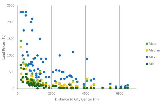 Urban models have been used for many years in order to better understand urbanization, and among the primary data used while constructing these models was the value of real estate. In the 19th century, Johann Heinrich von Thünen described the relationship between the distance to market, land use, and land prices in his famous theoretical work “The Isolated State” [3,4]. People preferred to live close to central business areas from the 19th century until the middle of the 20th century, prior to the development of public transportation and private vehicle ownership [5]. As a result, while land prices in city centers were high, decreased prices were observed moving away from the center. However, since the 20th century, along with personal vehicle ownership and increased population, cities have grown from the center to the periphery. This trend has also directly affected land prices and, due to growth, caused a large gap to be formed between the return of land that has urban land use and the value of the rent of agricultural lands [6]. This is an indication that urban models based on land prices have a linear structure. Although many models had been developed until the middle of the 20th century, it has been observed that these models were not successful enough in modeling cities because of their linear and static structure. With a new approach, cities have been considered as dynamic systems from the 1970s. Nowadays, cities are composed of many subsystems related to political, social, and economic life and space from the macro to the micro level [7]. Therefore, cities can be defined as living systems in which the level of complexity is infinite, and which are open, dynamic, and alive. This complexity demonstrates nonlinear structures. Chaos and complexity theories are of benefit to understand the behavior of complex systems.