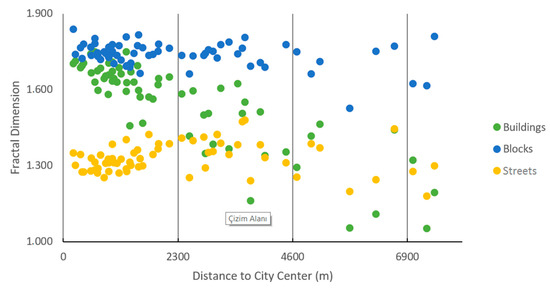 Afterwards, three 8-bit datasets with TIF extension, representing buildings, street networks, and blocks, were created separately for each neighborhood, and their FD values were calculated (shown in Appendix A). In the whole city, the FD values of buildings, streets, and blocks are 1.571, 1.619, and 1.787, respectively. As a result of the calculations, FD values change between 1.054 and 1.749 for buildings, between 1.526 and 1.838 for blocks, and between 1.181 and 1.481 for street networks. While the FD values of buildings and streets, in particular, are higher in the regions close to the city center, they decrease moving away from the center (Figure 6).
