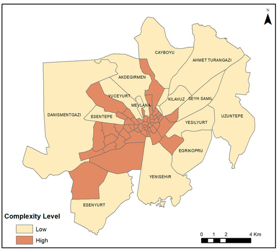 According to the two-step cluster analysis, 49 neighborhoods with a high population density were clustered near the center, and the remaining 16 were clustered in periurban areas (Figure 7). In neighborhoods with high complexity, the mean FD value was calculated as 1.623 for buildings, 1.751 for blocks, and 1.343 for streets, and these values were 1.303, 1.700, and 1.289, respectively, for neighborhoods with low complexity. In particular, calculation of block values as close to each other is thought to be caused by the inclusion of boundaries of some blocks, which are not present on the ground in places newly opened to settlement, because this dataset was produced from the plan data. This situation is interpreted to mean that the city will also have a high level of complexity in the future.