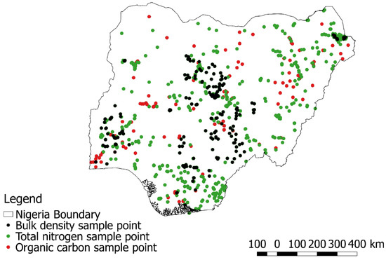 The Africa Soil Information Service (AfSIS) is a data dissemination portal that was launched in 2009 to fill the gap in the existing efforts to create digital soil mapping in Africa [13]). The project compiled datasets from two databases, the African Soil Profiles Database (the “Legacy Database”) and the AfSIS Sentinel Site database. The Legacy Database (version 1.2) now has more than 18,532 soil profiles, of which 17,160 are georeferenced records covering 40 countries in sub-Saharan Africa [39]. According to Leenaars et al. [39], data for the Legacy Database were collected from various forms (digital and analogue) of sources but has now been compiled and conforms to the same standard using quality control procedures, however, the sampling depths vary from 0 to 260 cm, 0 to 280 cm, and 0 to 280 cm for TN, OC, and BD, respectively. This study used the Legacy Database version 1.2 which covers almost all of Nigeria spatially but has substantial missing data. The SHIs BD, SN, and OC were extracted from the database. Table 1 shows the percentage of missing values for each SHI and Figure 2 shows the locations of each SHI. As shown in Table 1, OC had the highest sample size and spatial distribution, whereas BD had a smaller sample size and poor spatial representation due to missing data.