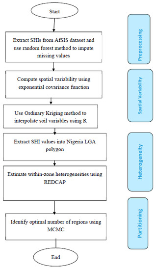 This paper aims to quantify the spatial variability of Nigeria’s SHIs using variogram modeling and to partition the total area into a set of spatially contiguous regions using the following soil properties: BD, SN, and OC. Variogram modeling is the process of defining a half-average difference between a pair of data points [20,21,22,23] and has been used to characterize the spatial variabilities of soil properties [24,25]. The next step is the partitioning of SHIs into regions that are realistic and feasible for activities including planning, sustainable agriculture, and investment. Several methods or approaches can be used to conduct this partitioning. For example, there exist methods in which attributes are first clustered and then spatially aggregated [26], heuristic techniques based on repetitive spatial partitioning [27], and a method involving the imposition of spatial constraints [28].