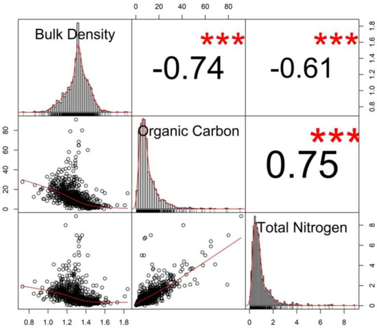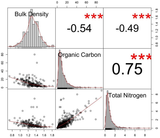 Scatterplots matrix of soil health indicators showing the histograms, kernel density overlays, absolute correlation, and significance levels (*** p < 0.001) of correlations between bulk density, organic carbon, and total nitrogen (before data imputation).