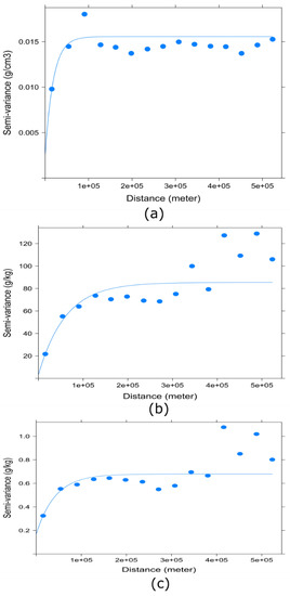 Variogram for (a) bulk density, (b) total nitrogen, and (c) organic matter. The solid blue line represents the exponential covariance function model fitted in the variogram.