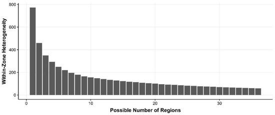 After deriving the within-zone heterogeneity, the next step is to determine the number of desired regions. This is often a subjective decision. Although other factors such as demographic or territorial dimensions can help determine the optimal number of regions [46], there is no mathematical solution in REDCAP to determine the optimal number. Instead, a change-point method can be used to efficiently and accurately determine the number of regions. The generated WZH is a time series derived from REDCAP, and the change-point method can identify abrupt changes or aberrations in the series. The Bayesian change-point technique [47] can be used to detect change points in a time series. Now available as a statistical package in R [31], change-point analysis is based on the MCMC Metropolis–Hasting method. Having a transition probability, ρ, the conditional probability of change at location j + 1 is obtained from the following equation [31,47,48]:
