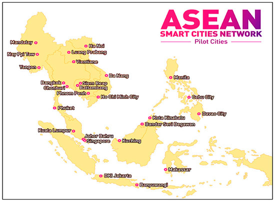 Map of the 26 pilot cities in the Association of Southeast Asian Nations (ASEAN) smart cities network (ASCN) showing their locations in the ASEAN member states.