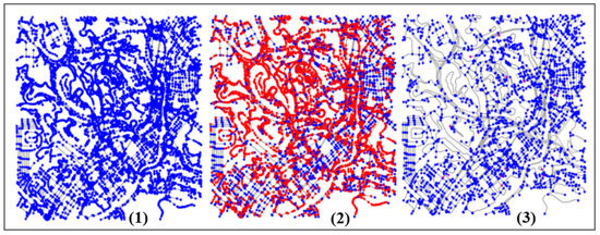 The simplification and correction of nodes of Kuala Lumpur within a 1.5 km buffer: (1) the extracted SNs, (2) number of red nodes to be removed, and (3) number of nodes and cul-de-sacs after correction.