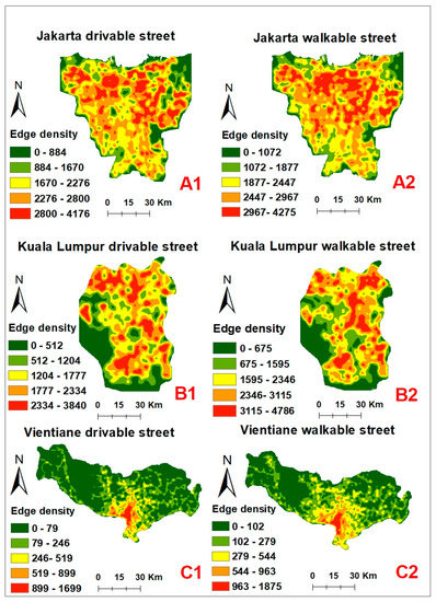 A comparison of edge density for metropolises (A1,2), midsized cities (B1,2), and small cities (C1,2) is shown in Figure 5. Jakarta is a metropolis whose edge densities of both DSNs and WSNs are highly dispersed, except the very northeast of the capital where edge densities are very loose. The edge densities for Kuala Lumpur are similarly dispersed in the whole city, but the highest densities are in the northeast parts. Unlike Jakarta and Kuala Lumpur, Vientiane has very high edge densities in the central-southern area, whereas the rest of the city, especially in the northern areas, has very low density. This result indicates that Vientiane is a monopolar city that retains a single centre, as even after the expansion of the city. In addition, the edge densities of WSNs in most cities are commonly higher than those of DSNs (e.g., DSNs and WSNs in Singapore in Figure 6). Moreover, the edge densities of both DSNs and WSNs are denser in the metropolis than in the midsize and small cities.