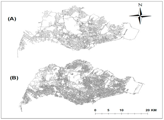 Comparison of drivable (A) and walkable street networks (B) in Singapore.