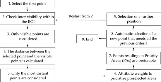 In detail, the m farthest points obtained from the distance evaluation (Equation (1)) are pointed out. If between them there are some points residing in PAs, then Pi is selected among those ones. If there is no intersection between the farthest points of the PCT (point cloud terrain) and PAs, then Pi is the farthest point of the PCT from P1, …, Pi-1. It goes without saying that the choice of m depends on how important the inter-distance is when prioritizing these areas. This makes sure that the user’s experience and knowledge play an important role in the procedure, despite the automatic nature of the tool. Prioritized areas can be areas closer to element at risk, region that have higher displacement values, the most accessible zones, the most stable points, or any areas where the user would like to place devices.