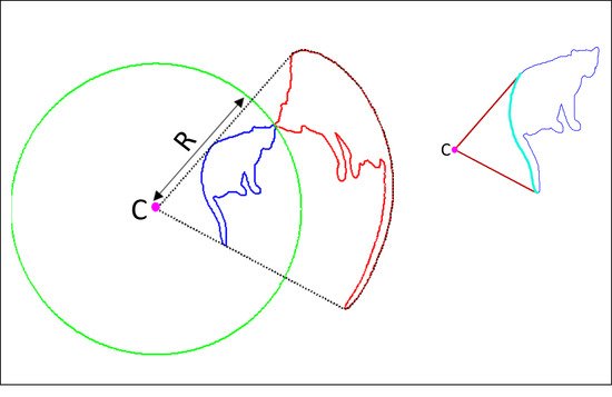 Hidden Point Removal operator. Blue, investigated point cloud. Green, sphere with radius R used to invert points by spherical flipping (left side). Points residing on convex hull of inverted points (cyan at top-right) are marked as visible from C (point of view; modified after Katz et al. [33]).