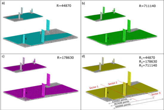 The Hidden Point Removal operator was developed for little objects like small sculptures. In the proposed method, dealing with huge point clouds, R is not constant but changes by increasing the distance from C (point of view) to the target, and it is not only a function of point density (homogeneous in ideal cases). Indeed, it also depends on the amount of points residing within a cuboid centered on C and having a half diagonal (D/2) equal to the distance from C to target. As shown in Figure 4d, given a point cloud (P), the number of involved points obviously grows with distance. The higher D/2 is, the higher the number of points is. In this sense, to correctly apply the operator, the distance has the same role as density: For points closer to C, a small R is recommended, while for farther points, a larger R is more suitable, as demonstrated in Figure 4, where the same R is not optimal for both closer and the farthest points. Too-high R values produce false positives (i.e., nonvisible points marked visible, Figure 4b), and too-low values originate false negatives (i.e., visible points marked as nonvisible, Figure 4a). Choosing a medium value for R is not a good solution since it involves a high number of false positives for short distances and false negatives for longer distances. To solve this problem, the point cloud was split in s cubic sectors centered in C, and R was evaluated for each of them. As a result, optimal R increases by moving away from C (Figure 4d). If the point cloud is divided in s sectors, visibility analysis is computed s time. For each of them, all points between C and sector s (included) were considered, but only the ones that are within sector s are marked as visible or nonvisible. Obviously, the more the sectors in which P is split there are, the more accurate the visibility-analysis results are and the higher the running time is.