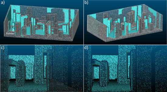 To check the reliability of the proposed algorithm, and with the aim to make the function of the code easy to understand step by step, a 3D model was produced and subsequently transformed into a 3D point cloud. The model was built to have low visibility and to highlight the WiSIO ability in positioning a network, ensuring complete inter-visibility. Furthermore, it allows users to easily perceive visibility from a given point of view (Figure 5). The model was designed on AutoCAD 3D (Autodesk, v. 20.0) and transformed into a 3D point cloud (made by approximately two million points) with CloudCompare (v. 2.10). First, validation was done by selecting generic point of view C, evaluating visible points from C, and exploiting the camera/eye center visualization function of the CloudCompare software (Figure 5). As shown in Figure 5d, all points detected as visible from WiSIO were indeed visible from C (in cyan), since there was no overlap of points. On the other hand, a small number of false negatives were reckoned up due to the precautionary R chosen for the test. The problem of false negatives can easily be solved by increasing the number of sectors. The higher the number of sectors is, the lower the number of false negatives and the higher the running time, as shown in Table 1, where data of three different approaches are reported. Note that Test 1 is the approach whose results are shown in Figure 5.