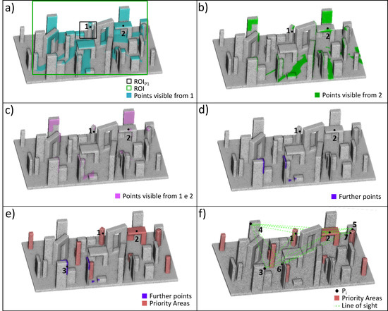 Only one generic point cloud P, made by 1,972,852 points, was used, since no vegetation was present in the model. Figure 6 illustrates the whole elaboration made by WiSIO to point out seven node positions, carried out in 3.33 minutes. Walls were removed to better display all the involved Pi. To detect P1, the iterative procedure was repeated three times. The automatically evaluated ROI around P1 (ROIP1) is depicted as a black box in Figure 6a. Moreover, some objects were randomly selected in the model and uploaded as PAs (in red in Figure 6e,f).