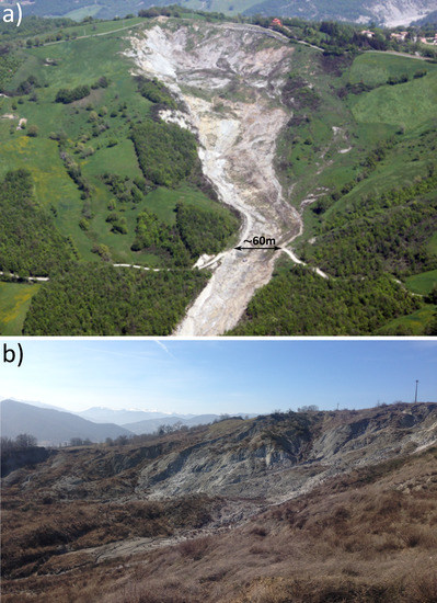 Roncovetro landslide. (a) Aerial image of mudflow and (b) detail of landslide’s crown.