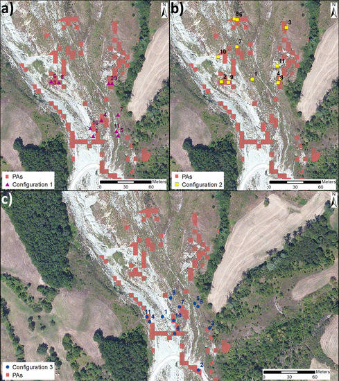 Different configurations obtained by changing the position of P1. Red dots represent points residing in cubes whose Zmax–Zmed value passed the 2 m threshold, i.e., priority areas. (a) Configuration 1; (b) Configuration 2; (c) and Configuration 3, the one used for the new installation of the Wireless sensor network for Ground Instability Monitoring (Wi-GIM) system.