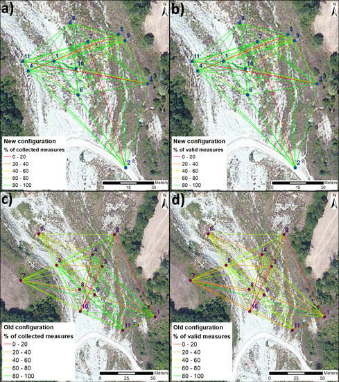 To better understand the effectiveness of WiSIO, a comparison between data from the 2016 installation and actual ones was pointed out, considering the amount of acquired data as their worth. The percentage of collected and valid data in the old, as in the new, configuration is shown in Figure 10, where valid data means the data with no outliers or zero values. In Figure 10a,b, the percentages of collected and valid measures, respectively, are reported in the form of colored links for each couple of nodes. As evident, values were between 90% and 100% for all couples, except for the four abovementioned pairs and for couples 1–5, 3–10, and 9–10. In these three last cases, both collected and valid data were between 45% and 50% (Figure 10a,b). The same procedure was done for data obtained with the old configuration, i.e., the 2016 one (Figure 10c,d). In this case, the percentage of collected data was less than 60% for 10 couples, and the percentage of valid measures did not reach 60% for 22 couples. That means that not only were fewer data acquired in the old configuration due to non-LOS problems, but data quality was most importantly worse, as well. Indeed, in the old configuration, data acquisition did not guarantee validity, as it is for the new configuration, where there was no discrepancy between the percentage of collected and valid data. Considering couples whose percentage of valid data was at least 60% as suitable, 50 out of 56 couples were suitable in the new configuration (i.e., 89.3%), instead of 34 out of 56 in the old one (i.e., 60.7%); thanks to WiSIO, the amount of valid data increased by 28.6%. An example showing this improvement is reported in Figure 11. Couples 1–11 from the old configuration and 2–3 from the new one were considered due to similar distance, position, and visibility conditions. They both collected at least 60% of the measures (even though it is strongly visible from Figure 11 that there was loss of data in couple 1–11) but yielded different results in terms of validity. Indeed, couple 1–11 presented several problems with outliers and multipath effects, issues which were eased in couple 2–3 (Figure 11).