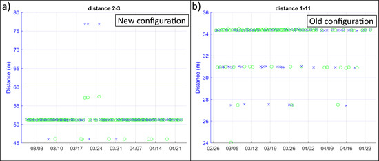 Comparison between data from new and old configurations. (a) Couple of nodes 2–3 and data from new configuration. (b) Couple of nodes 1–11 from old configuration. Green circles and blue crosses, distance from one node to the other and vice versa. Where measurement points were extremely dense, blue crosses were overlaid by green circles.