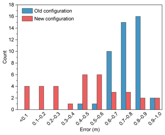 Histogram of errors in the new and old configurations. X-axis, error expressed as offset between real distances and ones evaluated by Wi-GIM. Y-axis, count shows number of couples. For old configurations, real distances were evaluated by means of a robotic total station, while, in the new one, they were measured on the georeferenced digital elevation model.