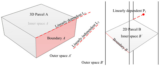 Definition 1: For a cadastral parcel A in a Euclidean space (a symbol for a category system of algebra in which denotes Euclidean space, denotes Homogeneous space, and denotes Conformal space) [38,39,40,41], the whole space can be divided into three parts: parcels’ inner space , parcels’ boundary , parcels’ outer space , .