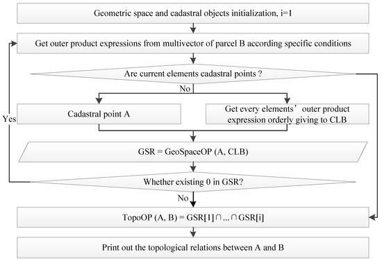 Since the outer product can be applied to all dimensional subspaces in conformal space, a recursive method can be adopted to iterate the calculation of the outer product among different dimensional cadastral constructive elements. By summarizing the topological information hiding in the results of the outer product among different dimensional elements, the topological relations between boundary points (boundary lines) and 3D cadastral parcels can be calculated. Based on the 9-Intersection model, a topological calculation framework for boundary points and cadastral parcels in 3D space is designed in accordance with cadastral elements’ CGA expression as shown in Figure 4. Since topological and geometric information of cadastral parcels is represented by a multivector structure, a grade operator is designed to extract the specific cadastral elements’ outer product expression at the first stage. Using a recursive method at the second stage, the outer product is applied into different dimensional cadastral elements hierarchically, because the meanings of the outer product in different dimensional spaces are consistent. Direction information contained in the results of the above outer product calculation is used for identifying different types of topological relations at the third stage. Since the boundary lines in the 3D cadastral space are straight lines and are composed of two boundary points, geometric union is introduced to calculate topological relations between boundary lines and cadastral parcels based on the results of topological relations between boundary points and cadastral parcels.