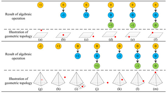 Since cadastral parcels in 3D space can be classified into traditional 2D parcels and 3D parcel volumes, topological relations between a boundary point and a cadastral parcel are divided into two categories accordingly. Topological relations between a boundary point and a cadastral parcel calculated by the CGA method are shown in Figure 7. There are 13 kinds of topological relations being distinguished in total. These two cases mentioned above are deduced respectively in this paper, because there are some differences in topological relation types among the boundary point and the 2D parcel as well as the 3D parcel volume. The topological relations in the graph consist of two parts: geometric algebra calculation result display and topological relations graphic display. Taking the boundary point and a 2D parcel in the graph as an example, in the process of calculating topological relations, the outer product of the boundary point and the 2D parcel’s CGA expression (the highest dimensional elements’ CGA expression in the multivector) is calculated first. If the result of the outer product is equal to 0, the outer product will be applied to the lower dimensional elements of the current boundary object. Relations between the result of the outer product and the topologies of different types in Figure 7 are illustrated in Table 1.