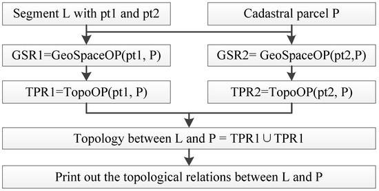 The 3D cadastral boundary line is a straight line composed of two boundary points. According to the topological relations between the two boundary points and the cadastral parcel, we can derive the spatial topological relations between the boundary line and the cadastral parcel. The algorithm flow of judging the topological relations between the boundary line and the cadastral parcel is shown in Figure 8 and consists of three phases: the first step is to carry out the operation of GeoSpaceOP between the two boundary points composing the boundary line and the different dimensional constructive elements of the cadastral parcel. The second step is to calculate the topological relations between the two boundary points composing the boundary line and the cadastral parcel, respectively. Thirdly, the operation of geometric union is employed to calculate the topological relations between the boundary line and the cadastral parcel according to the result of the topological relation between each boundary point and the cadastral parcel.