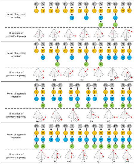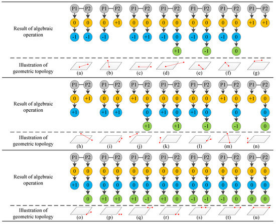 According to the topological relations and calculation framework between a boundary line and a cadastral parcel in 3D space, 21 types of topological relations between a boundary line and a traditional 2D parcel are obtained, and 27 types of topological relations between a boundary line and a 3D parcel are obtained, as displayed in Figure 9. The graph of topological relations between a boundary line and a cadastral parcel consists of symbolic processing of algebraic calculation results and geometric presentation of topological relation types. In the process of symbolic calculation of topological relation algebra, 0 indicates that the current boundary point is located at the boundary of the current constructive elements of the cadastral parcel; −1 means the current boundary point is in the interior of the current constructive elements of the cadastral parcel, while +1 indicates that the current boundary point lies outside the current constructive elements of the cadastral parcel. Yellow, blue, and green nodes correspond to three constructive elements in 3D cadastral space: surfaces, lines, and points, respectively. Throughout the symbolic processing part of the topological relation algebra calculation, only when the terminal node is non-zero or the GeoSpaceOP operator is applied to all relative dimensional elements in the hierarchical structure will it stop iteration of the topological relationship calculation. In the framework of topological relation calculation based on CGA, we can not only distinguish the inner, outer, and boundary topological relations, but we can also distinguish the external topological space according to whether or not there is linear correlation. For example, Figure 9g to Figure 9k and Figure 10g, Figure 10h, Figure 10i, Figure 10m, Figure 10o, Figure 10s, etc. are cases where the boundary line is located outside the parcel (both terminal nodes of the boundary line are equal to +1). Topological relationships at the cadastral parcel’s boundary can also be distinguished, such as partial overlap (Figure 9q and Figure 10n); encompassment in a boundary element (Figure 9s and Figure 10v) and adjacency to the boundary co-point or collinearity (Figure 9t, Figure 9u, Figure 10w, Figure 10x, Figure 10y, Figure 10z and Figure 10aa), etc.