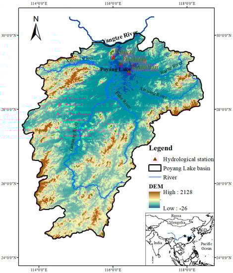 Poyang Lake is located in the southern part of the middle reach of the Yangtze River Basin in northern Jiangxi Province, approximately between 114°41′35″ and 116°50′26″ longitude and 27°3′18″ and 29°55′55″ latitude. The lake has a watershed area of 162200 km2 and is controlled by a subtropical, monsoon climate. It receives inflows from five rivers, namely, the Xiushui, Ganjiang, Fuhe, Xinijiang and Raohe. Accordingly, the area of Poyang Lake varies significantly, and the minimum and maximum areas are 244 km2 and 4553 km2, respectively, due to the seasonal precipitation and special topography [].
