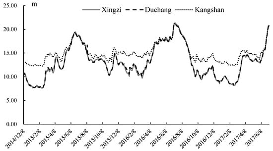 The hydrological regime of Poyang Lake is complicated by a strong river–lake interaction and complex hydraulic connection. Xingzi, Duchang, and Kangshan stations are the main hydrological stations. Duchang station is located in the central part of the lake, and Kangshan is located at the southern part of the lake. Xingzi Station is located on the northern edge of the lake and away from the junction of the lake and Yangtze River. Similarly, they are all located in Poyang Broad Lake (Figure 1). Here, we used the observed water level data from the three gauging stations to analyse their relationship, and the time span of the data is 8 December 2014 to 8 July 2017 (Figure 2 and Table 1). The Pearson correlation coefficient revealed that the water level at Xingzi, Duchang, Kangshan stations are closely related, so they can all be used to reflect the hydrological regime of the lake. In spite of this, Xingzi is considered the best station to stand for the water level of Poyang Lake and reflect the proximal effect of the river because slight differences of the lake level could be observed [,,]. Moreover, due to its unique position, the water level variation of Xingzi station can not only reflect the hydrological regime of Poyang Lake, but also reflect the influence of Yangtze River. Li [] employed a physically based hydrodynamic model to quantify the contributions of the river to the lake’s water level variation. The study found that, between April and June, the water level changes at Xingzi station were more remarkable than those at Duchang, Tangyin, and kangshan station affected by the 30% reduction of Yangtze River discharge. Additionally, a more notable variation of the water level was observed in the northern parts of the lake affected by the increment of Yangtze River discharge. Further, model simulations revealed that, between July and August, the Yangtze River imposed a greater influence on the water level, resulting in a change as much as 0.68–2.61 m. Meanwhile, these changes reduced from North to South. In summary, Xingzi station was selected to represent the water level of the lake and it could reflect the influence of the Yangtze River. Additionally, it has been established for a long time, so it has a long history of observation. In the current research, Xingzi Station was selected as the representative hydrologic station downstream of the Yangtze River, and the water level data was selected to analyse the variation of the water level downstream of the Yangtze River.