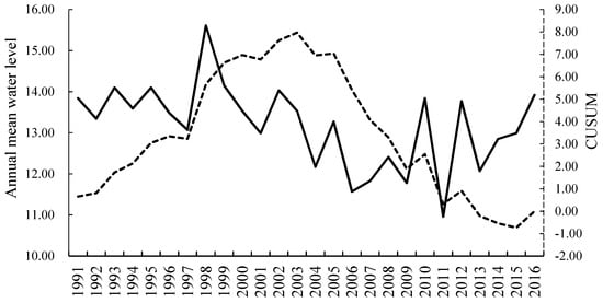 Annual mean water level and combination of cumulative sum charts (CUSUM) for 1991–2016. (The solid line is the annual mean water level, and the dashed line is the CUSUM of corresponding parameters.).