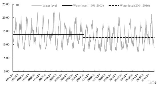 The annual mean time series and CUSUM are shown in Figure 3. A declining trend was found in the annual mean time series of the water level at Xingzi Station. For 2003, a change point was discovered in the time series of water levels because a sudden change in the direction of the CUSUM occurred in 2003 (change from the positive to negative direction). By performing the bootstrap procedure, the confidence level for the change point of the water level was found to be 100%, which was above the 95% significance level. Furthermore, Poyang Lake showed a mean water level of 13.82 m before 2003, which decreased to 12.57 m after 2003. The difference of the water level between the two periods is statistically significant (p=0.001<0.05, t test). Additionally, the daily water level at Xingzi Station of Poyang lake from 1991 to 2016 is presented in Figure 4. To make it clear and concise, the average water levels during the two periods, 1991–2003 and 2004–2016, were calculated and presented. The average water level before 2003 was 13.80 m, and it was 12.57 m after 2004. There are significant differences between the two periods.
