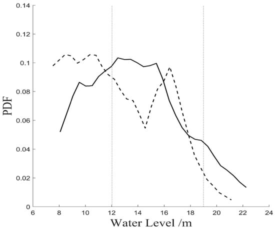 Visually, the distributions of the water level in the two periods are obviously different. The frequency distribution is unimodal in the early period, and the peak lies at approximately 13–15 m. In contrast, the frequency distribution is bimodal in the latter period, and the two peaks lie at 9–10 m and 16–17 m, respectively, which are higher than the frequency distribution values in the early period. Time spent at 13–15 m, which was the peak of the frequency distribution covering the early period, appeared obviously lower in the latter period. The striking result was that the frequency distribution in the latter period was obviously lower than that in the early period over the range of 18–22 m. Furthermore, a more pronounced characteristic was that, over the range to the left of the left vertical line, the frequency distribution in the early period was higher than that in the latter period, while the trend was reversed over the range to the right of the right vertical line.