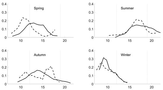 Poyang Lake showed strong seasonality in the distribution of the water level across the two periods. This paper selected the periods from March to May, June to August, September to November, and December to February as spring, summer, autumn, and winter, respectively. The frequency distributions of the water level for the four seasons, namely, spring, summer, autumn and winter, were computed for the two periods, and the results are shown in Figure 6.