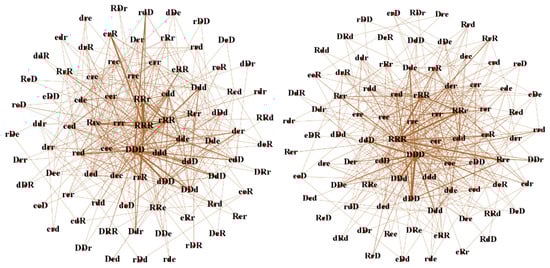 As we can see, the differences among the BC of nodes before TGD are evident. According to the statistics, the summed BC of the first 10 nodes in the network before TGD is 55.54%, and the BC of any of the 10 nodes is more than 2.7%, that is 12.19% of the total 82 nodes account for 55.54% of the summed BC of the network. Then, for network after TGD, the fluctuation of the magnitude of BC is mild. The summed BC of the first 10 nodes is 55.98%, and the BC of any of the 10 nodes is more than 3.7%. Besides, the BC of RRR nodes, which is the top one in the two networks, dropped from 15.97% in the early period to 9.94% in the latter period. In addition, except for the two mutual patterns RRR and DDD, there are two continuous declining patterns consisting of d and D only, ddd and dDD, in the network for the early period and their BCs are 4.50% and 3.44%. However, for the network in the latter period, there is no continuous declining pattern consisting of d and D only.