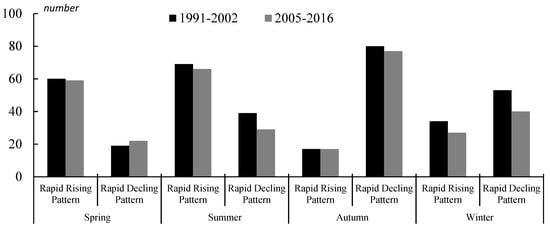 The differences of seasonal variation of the water level in the two periods were further revealed by counting the number of rapid rising patterns and rapid declining patterns of the four seasons. Here, we mainly focused on the differences of rapid variation patterns in the two periods—therefore, slow variation patterns were not calculated. The results are shown in Figure 8.