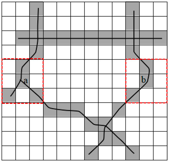Mathematical morphology processing, which has been widely used in the road extraction of remote sensing images, is a computational method for grid space. Remote sensing images contain a variety of different spectral information, which have a great impact on road extraction, while images generated by rasterization based on taxi GPS trajectories are not interfered with by other ground information, thereby producing better results. In addition, using the mathematical morphology approach requires less time to process the trajectory data. Based on our observations, the cells in which the number of pixel points in eight neighborhoods is more than two in single-pixel “center-lines” have the greatest opportunity to be road intersections. As shown in Figure 3, cell a is an example of a road intersection, while cell b is an example of a non-intersection. In this study, we used the mathematical morphology method to obtain the single-pixel “center-lines” and extracted the intersections by identifying the number of pixels in each pixel’s eight neighborhoods.