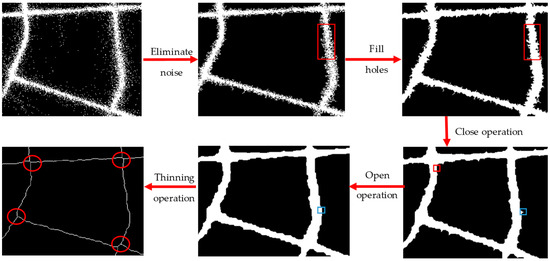 Step 2: Preprocessing the raster image. To accurately restore the shape of the original image, the etched image is used as the marker image and the original image as the mask image for the mathematical morphological reconstruction to eliminate outliers. At the same time, the reconstruction involves an iterative dilation process, which can ensure that holes are filled without changing the shape of the object. Operation preprocessing, such as open and close operations, can also be used to achieve image enhancement and smoothing, respectively.