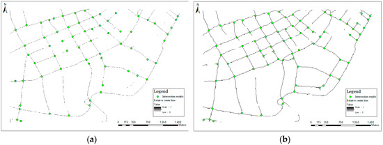 Intersection and relative center line extraction results from different resolutions via rasterization: (a) 2.5 m results; (b) 5 m results.