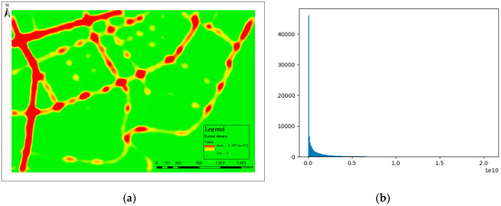 The GPS trajectory points in the study area range from thousands to millions, and the presence of discrete points (noise points) may result in the detection of false intersections. Since it is impossible to process the entire study area directly using the CFDP algorithm, KDE is used for data smoothing.