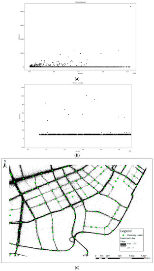 Extraction results by clustering: (a) decision graph; (b) amplifying result; (c) intersection extraction results (overlaying 2.5 m raster track data).