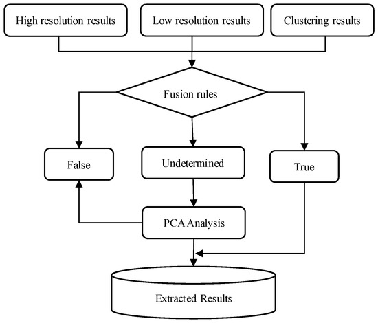 Considering the density characteristics of the road intersections compensates for the morphology extraction results, but also results in some pseudo intersections. Consequently, we proposed a variety of fusion rules (listed in Table 1) based on our extraction results, including high-resolution results, low-resolution results, and CFDP clustering results, to help recognize the undetermined results and reduce the error rate of eliminating pseudo intersections. If only high-resolution results or low-resolution results are present within the distance of a given fusion threshold R1, then the intersections are false. If only the CFDP clustering results are present, then the intersections are undetermined. In other situations, the fusion results are based on the high-resolution results (if they exist). Otherwise, the fusion results are based on the low-resolution results.