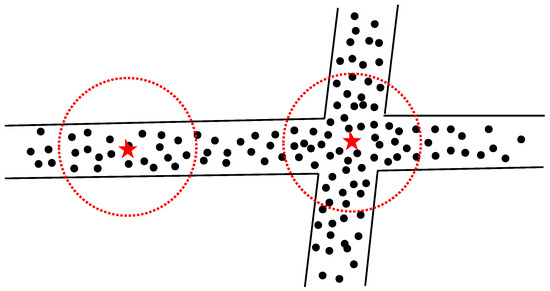 According to the decision diagram of the relationship between and , the cluster center, which is a candidate for intersection points, can be selected. Because the distribution of the GPS sampling points is inconsistent, if the distance and density threshold are considered at the same time, the sparse area extraction results will be affected, and the integrity of the extraction results will be reduced. Therefore, this paper takes into account the special qualities of intersections and only considers the distance threshold.