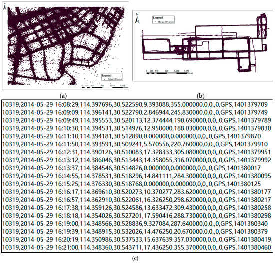 Wuhan dataset covers a region of 4.2 km × 2.8 km, containing about 2000 taxi trajectories and nearly 800,000 trajectory points. The average sampling interval of the dataset is more than 40 seconds. The experimental area is an old central urban area near Hankou in Wuhan city, and the track points are unevenly distributed on different volume roads with significant noise, as shown in Figure 15a. Part of the dataset can be shown in Figure 15c. The Chicago dataset, which has been widely used in related work [33] and is available on the website [34], is relatively clean and contains 118,364 GPS points and 889 trajectories within a region of 3.88 km × 2.4 km at the University of Illinois in Chicago, as shown in Figure 15b.