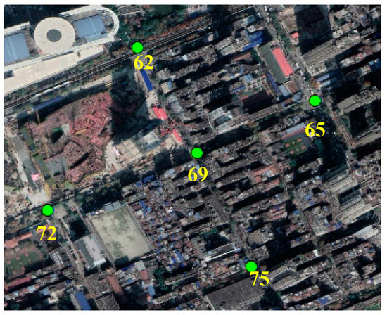 The Intersection–Link relationship can be used to extract the single/double direction information and turning relationship of the road network. Taking intersection 69, extracted from the Wuhan dataset, as an example (shown in Figure 18), the result of this relationship is shown in Table 3 and Table 4.