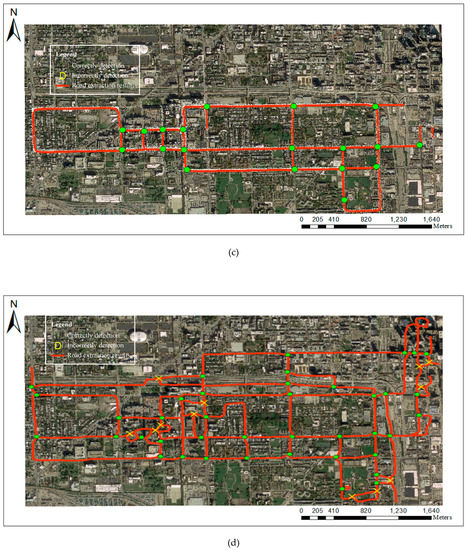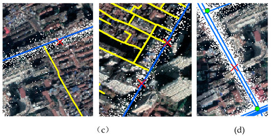 The road segments around the intersections are distorted and broken. In this section, we build buffers for intersections. We set 80 m (the same as the fusing threshold R1) as the buffer radius and designed the specific algorithm to adjust the roads’ endpoints falling into the buffer of the relative intersections to correct the position and shape of the road segments around the intersections, as shown in Figure 12a,b. At the same time, we also connected the fractured segments according to the broken segment’s distance and direction deviation, or the distance and direction deviation between the broken segment and the relative intersection, by using extracted intersection results, as shown in Figure 12c,d.