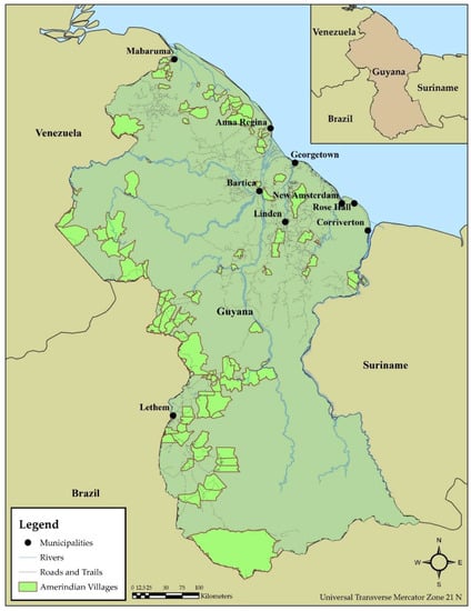 Data for this study were collected for Guyana, South America’s (Figure 1) only English-speaking country. Over the past two decades or so, crime, especially violent cases, has increased in Guyana [19,36]. Concurrent to the increase in crime has been a gradual opening up of the Guyanese frontier for various resource extraction activities, primarily gold mining and logging. As a result of increasing access to the frontier, more people are moving away from the coastal zone, where around 90% of the country’s population currently resides. Most of Guyana’s population reside within the environs of the nine municipal centers (Figure 1). The last census for Guyana suggested that the overall population, of around 746,955 persons, is declining, but that of indigenous nations is growing [38]. The Census characterized the Guyanese population into six major groups, based on their ancestry: Indian, African, European, Chinese, mixed, and Amerindian. Of these groups, the first four live primarily along the coastal zone, while Amerindians, who are indigenous to Guyana, account for around 10.2% of the national population and live in 96 villages (Figure 1), distributed across the forested and forest-edge landscapes.