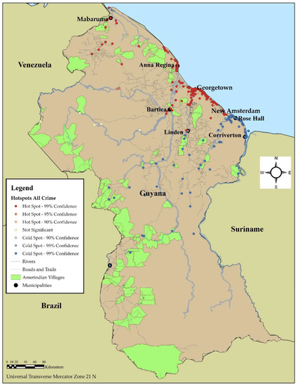 To study the spatial distribution of crime, we drew on a Hot Spot Analysis clustering function (Getis-Ord Gi) in ArcGIS. Based on work by other scholars in the area [19], we expected hotspots of crime to be present in the vicinity of Georgetown and surrounding areas. The count of crimes at each location in our database was used as the weight to complete the Hot Spot Analysis. To examine the distribution of the data away from the coast and towards indigenous villages, we used two centrographic statistics for spatial data that are commonly used in criminology [42,43]. The first tool was the mean center: