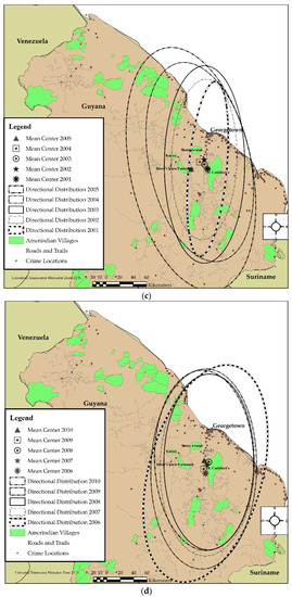 where is the mean of the x coordinates of all locations, is the mean of the y coordinates, and n is the number of points in the dataset. The mean center was used to provide a sense of the central focal point of the data [42], and how this shifted over time as the number and distribution of violent crime changed. As the mean center can vary based on the characteristics of the dataset, including the presence of outliers [42], and the fact that the boundaries of places were unavailable for analysis, we opted to develop the standard deviational ellipses to assess whether the distribution of violent crimes changed across the Guyanese landscape. The standard ellipses are elliptical in shape, with a long axis running the longest straight line distance from end to end and through the mean center, and a short axis which is perpendicular to the long axis and also runs through the mean center joining the closest edges of the ellipse [42]. The ellipse gives an indication of the dispersal of the points, where a larger ellipse means a greater dispersion of points, but the direction of the longer axis of the ellipse indicates the predominant alignment of the data dispersal. Long narrow ellipses are indicative of a linear data pattern, while rounder ellipses suggest that the point pattern is more evenly distributed in all directions around the mean center [42]. The computation of the mean center and standard deviation ellipse were completed in ArcGIS using the tools for measuring geographic distribution. We assessed changes in the mean center and the standard deviation ellipse to infer how crime’s focus may impact areas beyond Georgetown and other municipal centers (see Figure 1). Beyond computing the mean center for crime, we used Amerindian villages as a proxy for impacts away from Georgetown, the main municipal center, and examined changes in crime’s mean center relative to that of the Amerindian villages’ mean center. For this analysis, we compared the distance of the mean center of Amerindian villages to the five categories of violent crime covered in the analysis. Because the computation was completed for each crime type, the data were disaggregated and, as such, were smaller samples. Because data were absent for some years, the distances to mean centers were compared across the periods 1986–1995, 1996–2000, 2001–2005, and 2006–2010, in roughly five-year intervals, with the exception of the 1986–1995 period.