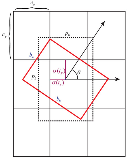 As illustrated in Figure 3, we redefine a sloping bounding box in the shape of a red rectangle, which is represented as a five-dimension vector { b x , b y , b w , b h , θ } . ( b x , b y ) represents the centre of the anchor box, b w and b h are the width and height, respectively, and θ is the orientation angle. In the 5-dimension vector, θ is defined as the angle between x-axis and the side with positive slope.